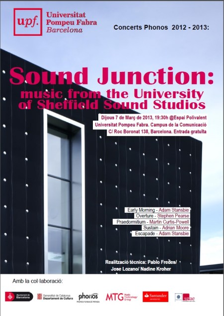 I’m travelling to Barcelona next week to present a concert of electroacoustic music from the University of Sheffield at PHONOS at the Universitat Pompeu Fabra (details should appear here soon). The concert will include pieces by me, Adrian Moore, Stephen Pearse and Martin Curtis-Powell. Come and say hello if you’re in Barcelona...