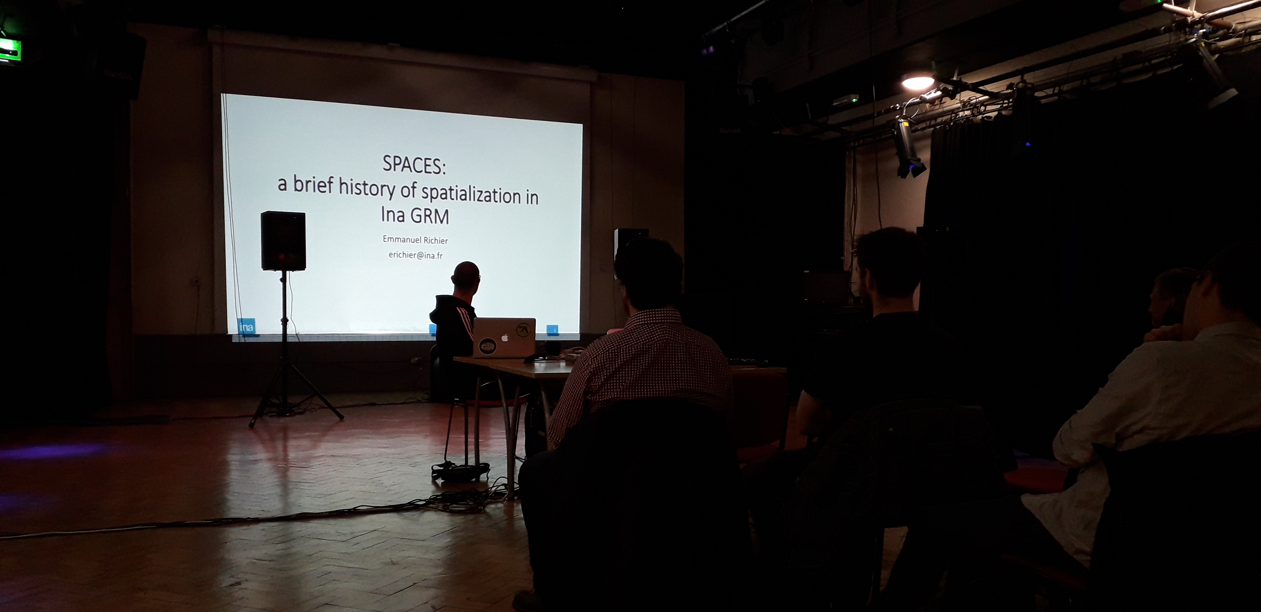 Last week, we were very happy to receive a visit from Philippe Dao and Emmanuel Richier from the GRM. In addition to being unbelivably lovely people, Philippe and Emmanuel presented on the history of the GRM, the interest in space, and the purpose-built space tools. They also presented some recent works in a small concert. Here are some photos of them during the event: